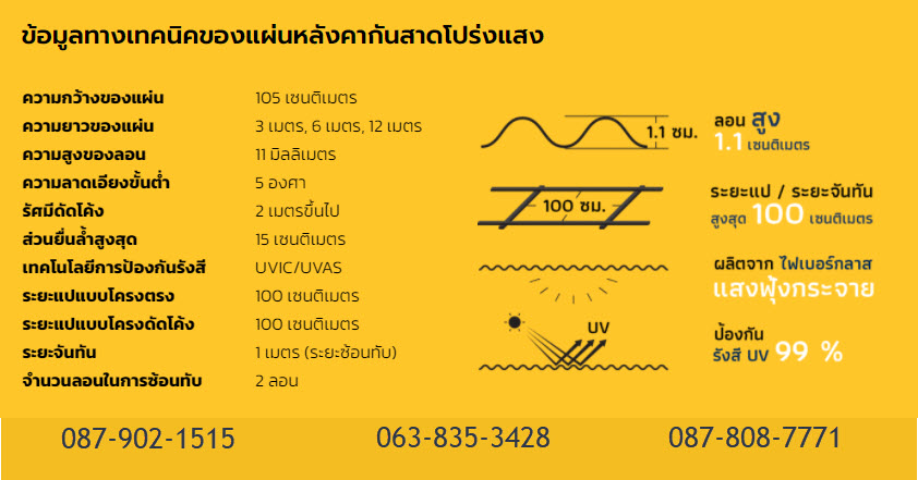 แผ่นโปร่งแสง หลังคากันสาด แผ่นโปร่งแสงสำหรับอาคารบ้านเรือน เหมาะสำหรับติดตั้งเป็นกันสาด เป็นแผ่นโปร่งแสงในประเภทไฟเบอร์กลาส Fiberglass Reinforced Plastic (FRP) เป็นวัสดุที่มีความแข็งแรงทนทาน ให้แสงส่องผ่านที่เป็นธรรมชาติ ฟุ้งกระจายตัวได้ดีไม่เป็นลำแสง ช่วยให้แสงเข้าสู่ตัวอาคารบ้านเรือนลดการใช้พลังงานไฟฟ้าในการส่องสว่าง